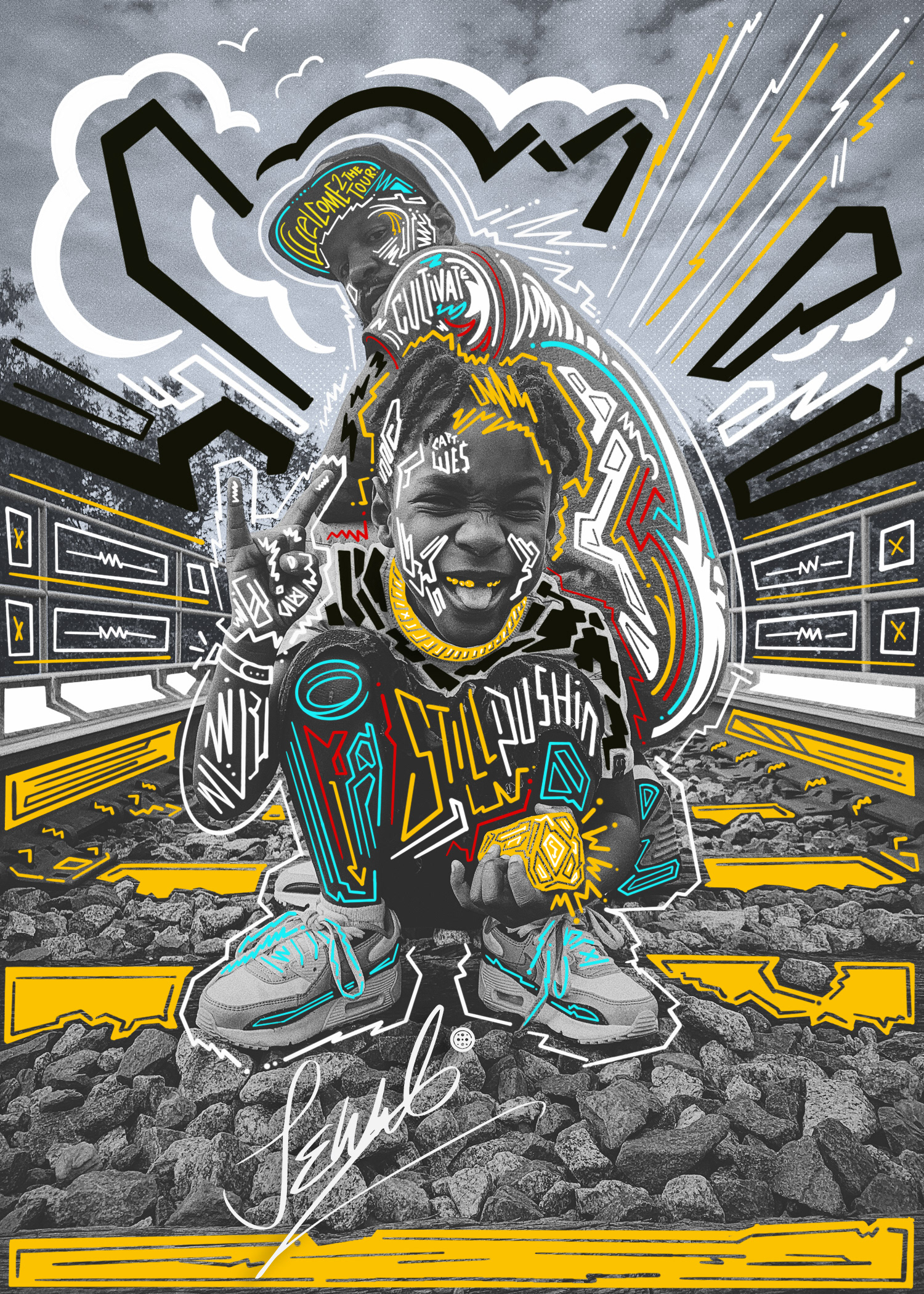 Self-Portrait. Artist's Statement: An exploratory concept developed from a photograph captured of my son and I on the railroad tracks. A typical day of throwing rocks while taking in a breath of fresh air. A continuation series inspired by my art piece titled "Push the Limit to the Sky."